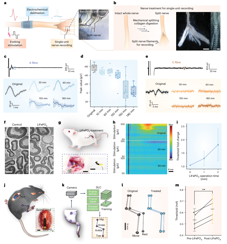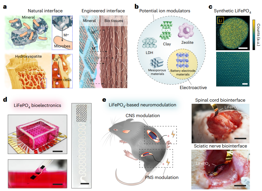 锂电池材料助力精准神经调控。 当锂电池材料遇上神经调控,会发生什么?答案可能比想象中更直接:一种原本用于储能的经典电池材料,如今被重新赋予了生物调控功能。近日,美国芝加哥大学田博之教授与刘翀教授团队合作提出了一种基于锂电池材料的生物电子调控策略,直接利用锂离子电池正极材料磷酸铁锂(LiFePO4)作为生物电子界面,在生理环境中按需释放锂离子,从而实现对神经活动的局部抑制。2026年3月27日,相关成果以MOBILE平台为核心,以Mineral-originated bioelectronics for inhibition via lithium electrochemistry为题,在线发表于Nature Materials期刊。博士生成哲为论文第一作者及共同通讯作者。