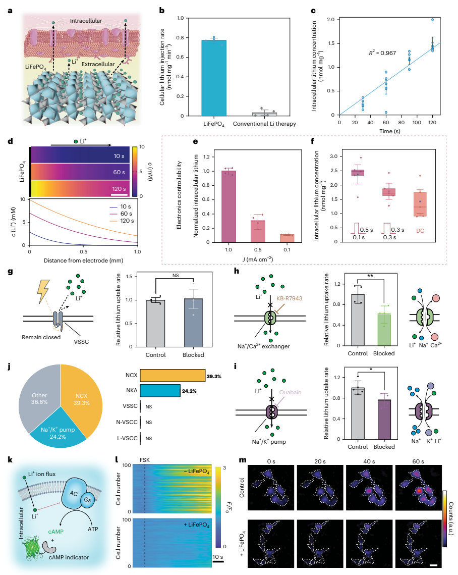 在多种可能参与神经调控的离子中,锂离子具有特殊意义。长期以来,锂盐已被用于临床,并被认为能够通过多种细胞内通路影响神经系统活动。不过,传统锂盐治疗通常依赖全身递送,难以在目标组织实现高效、局部、可控的作用。基于这一认识,该工作并未将锂简单视为一种化学成分,而是希望借助成熟电池材料中储锂—释锂的可控过程,在器件与组织界面建立一种局部、精准、可编程的锂离子递送方式。