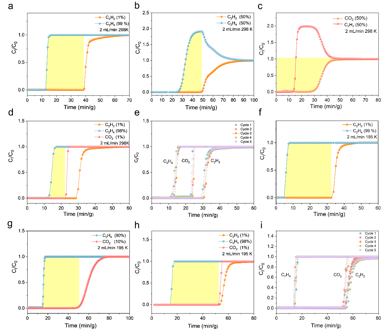 图4:UPC-197在(a-e)298 K和(f-i)195 K下对不同混合气的穿透曲线。