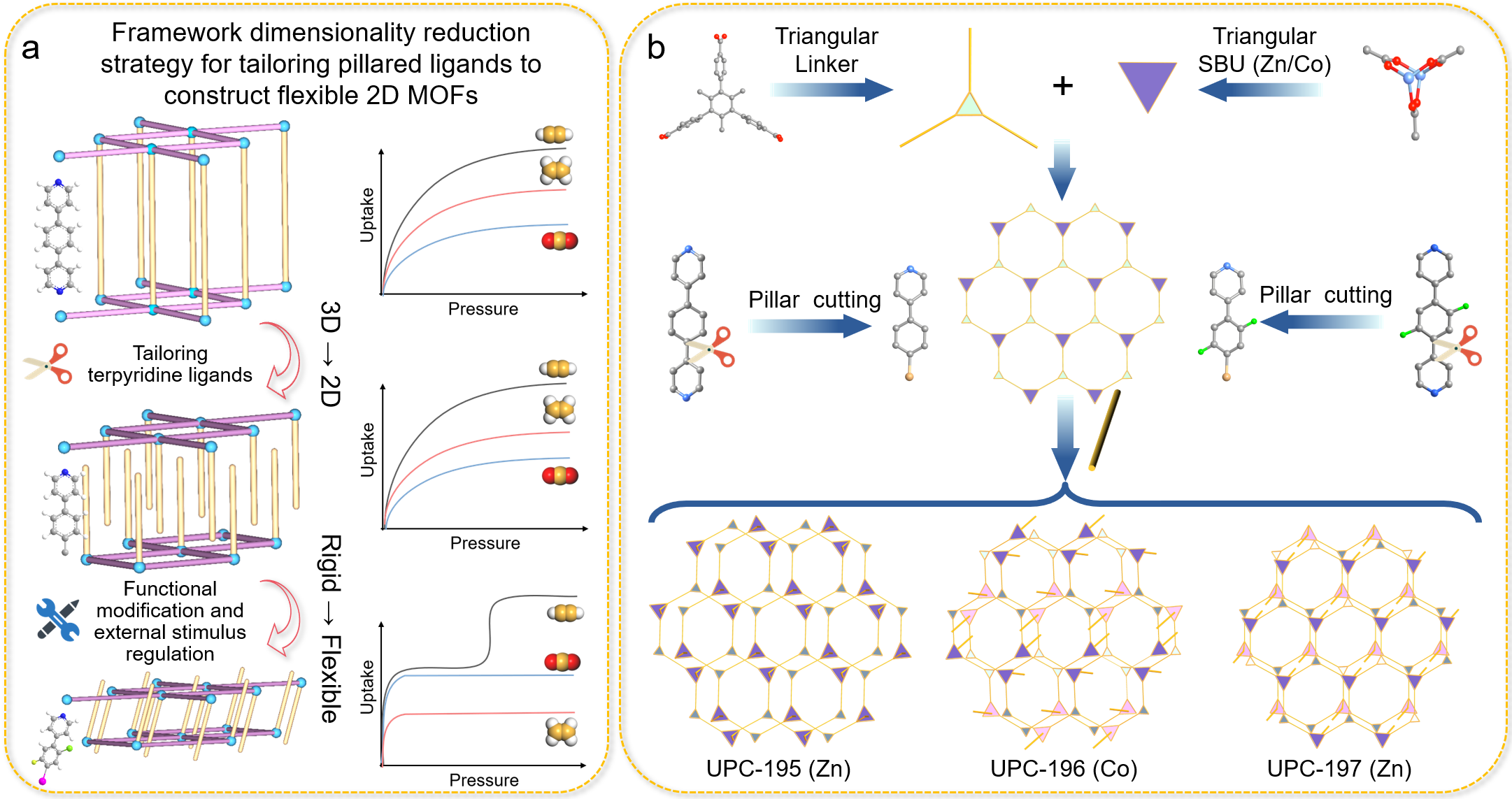 孙道峰教授团队长期从事晶态多孔材料设计与调控和气体吸附与分离研究,在前期工作中基于三甲基功能化配体(H3TMTA = 4,4,4-(2,4,6-三甲基苯-1,3,5-三基)三苯甲酸)、三联吡啶柱配体(dpb = 4-双(4-吡啶基)苯,fdp = 4,4-(2-氟-1,4-亚苯基)二吡啶,dfdp = 4,4-(2,5-二氟-1,4-亚苯基)二吡啶)与Zn2+组装,构建了一系列同构的三维柱层式MOF—UPC-191~193(Sep. Purif. Technol. 2024, 340, 126683)。对于三维柱层式MOF,设想将双连接的柱配体剪裁为单连接,即打破配体的对称性和连接性,层间便无法扩展形成三维骨架。基于此,该项工作发展了一种用于柱配体剪裁的框架降维策略:以UPC-191为模板,通过切割dpb形成半柱配体(dbp = 4-(4-溴苯基)吡啶),并将其与Zn2+组装,得到具有相同蜂窝层状结构的二维MOF。通过半柱配体的修饰以及金属离子调控,对层间和层内孔环境进行协同优化。采用双氟功能化半柱配体(dfbp = 4-(2,5-二氟-4-溴苯基)吡啶)构筑的UPC-197,在195 K下表现出温度响应的框架柔性以及对C2H2独特的门控效应,能够有效分离C2H2/C2H4和CO2/C2H4,并一步从C2H2/CO2/C2H4混合气中纯化得到C2H4。