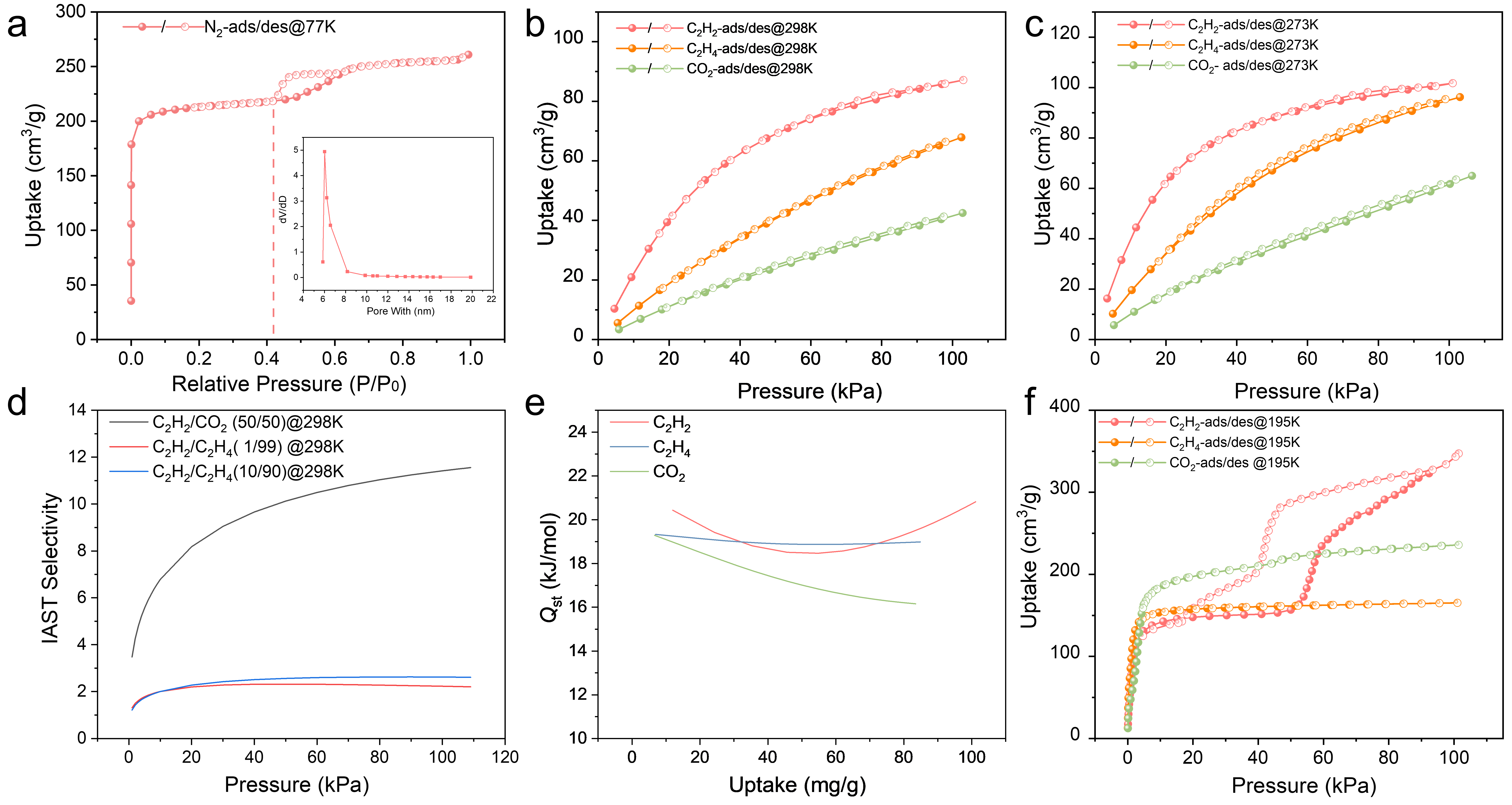 双氟功能化的最优框架UPC-197在195 K下表现出对C2H2独特的门控效应,并对CO2/C2H4呈现吸附反转,在C2H2/C2H4(1/99)和C2H4/CO2(90/10)以及C2H2/C2H4/CO2(1/98/1)混合气中均具有良好的C2H4纯化能力。
