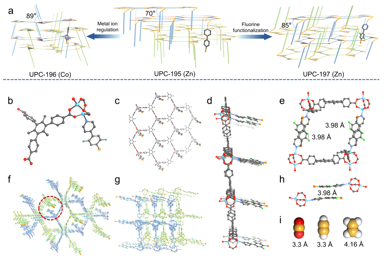 该研究采用柱配体剪裁的框架降维策略,通过半柱配体的修饰以及金属离子调控,成功构筑了三种蜂窝层状二维MOF,实现了层间和层内孔环境的协同优化。UPC-197中的半柱状配体苯环之间的层间距为3.98 Å,正好介于CO2、C2H2和C2H4的分子动力学直径之间。