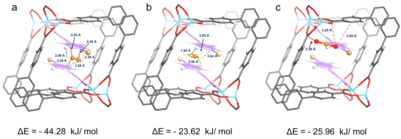 图5:UPC-197对不同气体分子的DFT-D优化吸附构型及结合能。