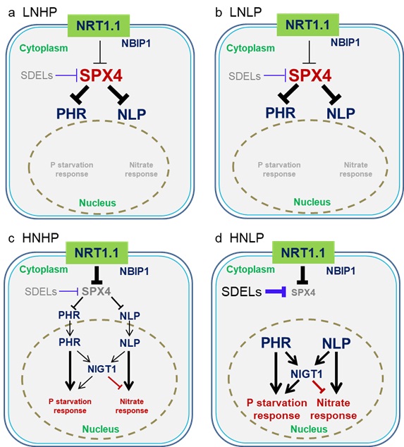 图: 植物在不同氮磷营养条件下的氮磷互作调控网络。(a和b)在低硝酸盐条件下,无论磷酸盐利用率高低(LNHP或LNLP),SPX蛋白都在细胞质中高度积累,PHR和NLP滞留在细胞质中,抑制磷饥饿应答基因和硝酸盐应答基因的表达。(c)在高硝酸盐和高磷酸盐条件下,SPX蛋白部分被NRT1.1-NBIP1介导26S蛋白酶复合体降解,PHR和NLP蛋白得以释放,从细胞质穿梭至细胞核激活磷饥饿应答基因和硝酸盐应答基因的表达。在NLP和PHR转录因子的控制下,NIGT1进一步调控了磷饥饿应答基因和硝酸盐应答基因的表达。(d)在高硝酸盐和低磷酸盐条件下,NRT1.1-NBIP1和SDELS均能介导SPX蛋白降解,导致细胞质中SPX蛋白积累量极低,且PHR和NLP胞核穿梭率高,从而强烈激活磷饥饿应答基因和硝酸盐诱导基因的表达。PHR和NLP可诱导NIGT1的表达,进一步调控磷饥饿应答基因和硝酸盐反应基因的表达。蓝色、黑色和深红色条分别代表蛋白质降解、胞质核穿梭抑制和转录抑制。黑色箭头代表转录激活。线条宽度代表调节强度。